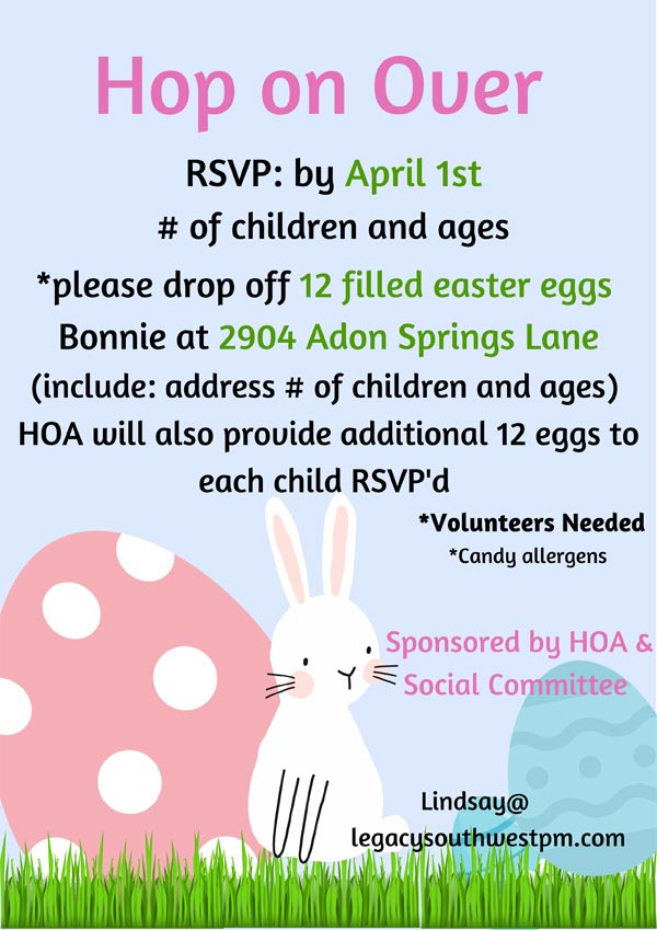 There are always opportunities in our community to share your knowledge, experience, and talents. Currently, there are openings on each committee in our Association that need volunteers; we need you! Landscaping, Social, Architectural Control, Welcome…it’s easy to find a committee you can have fun with.